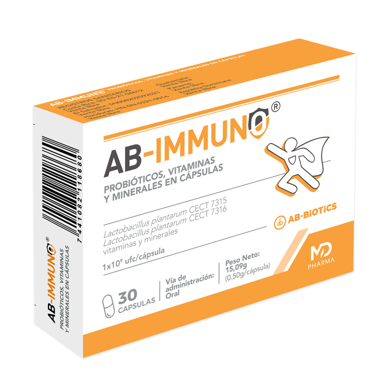 AB-Immuno es un probiótico formulado para fortalecer el sistema inmunológico. Contiene dos cepas diferentes de Lactobacillus plantarum (CECT 7315 y CECT 7316) combinadas con un conjunto de vitaminas y minerales: Vitamina C, Zinc, Vitamina A, Vitamina B6, Vitamina B9, Selenio y Vitamina B12.